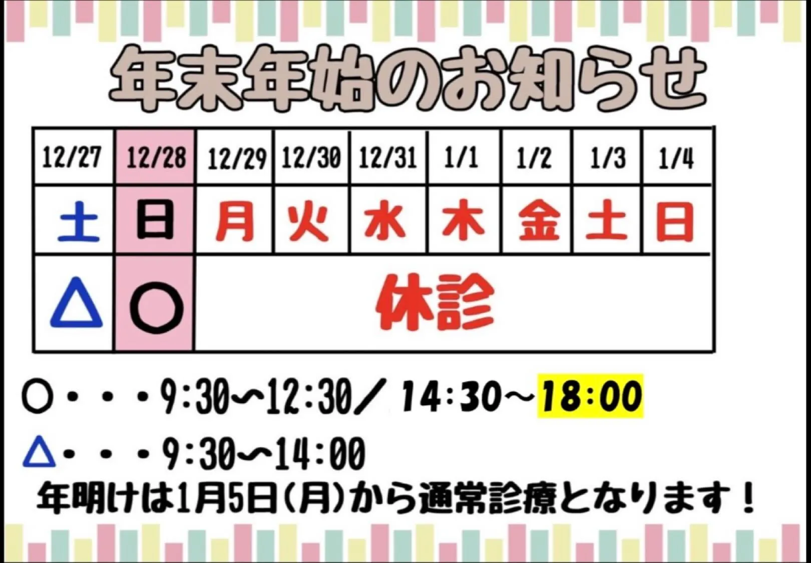 なお12月28日(日)を最終診療日とさせていただき、その日は18時までの診療時間となりますのでお気をつけ下さい!🙇🏻♂️