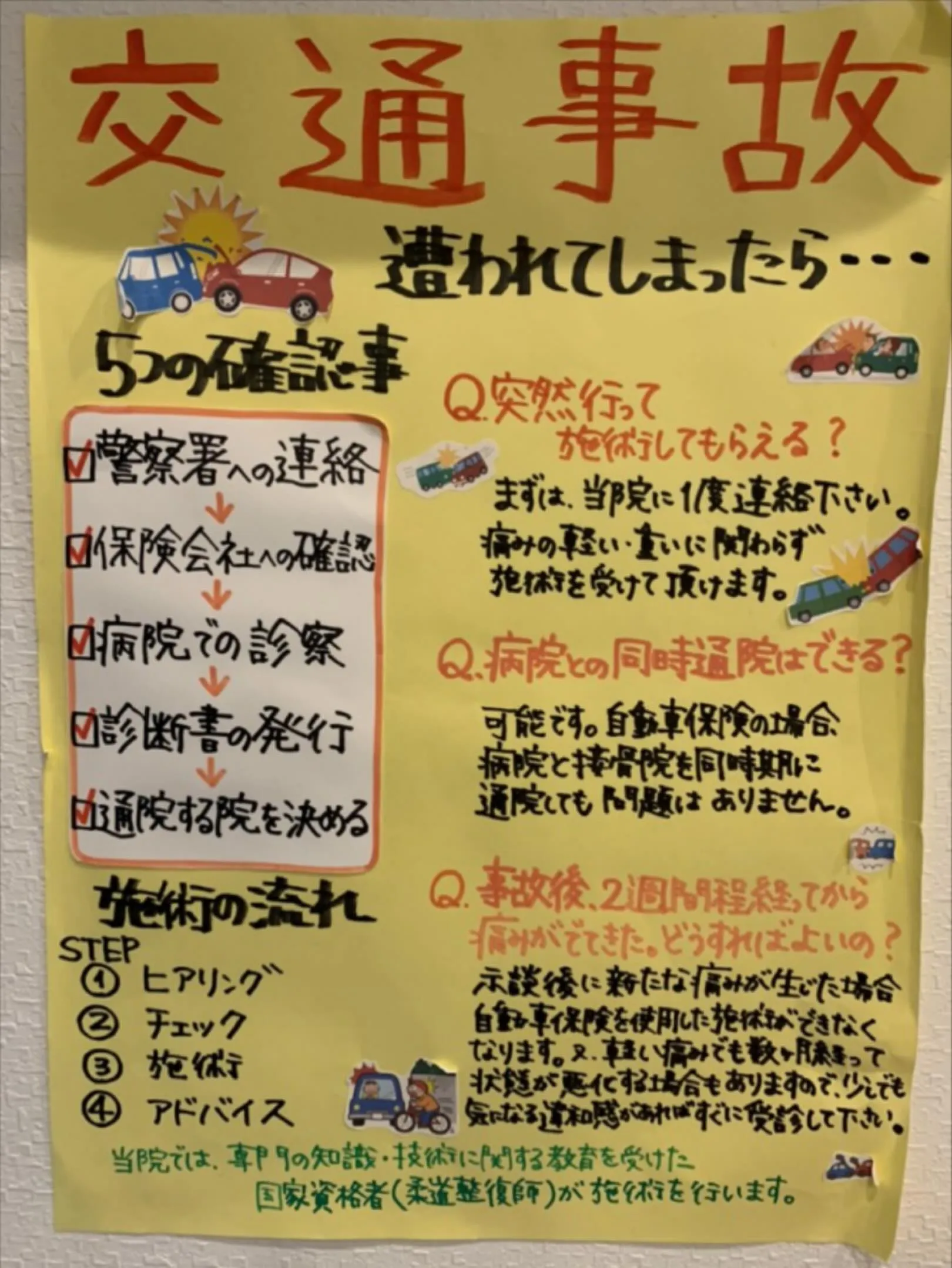 しかし、万が一交通事故に遭ってしまった時もご安心ください。当院では自賠責保険を利用した治療も承っております。交通事故による痛みや不調は、放置せずに早めに対処することが大切です。経験豊富なスタッフがお客様一人ひとりの症状に合わせた最適な治療を提供いたします。まずはお気軽にご相談ください。