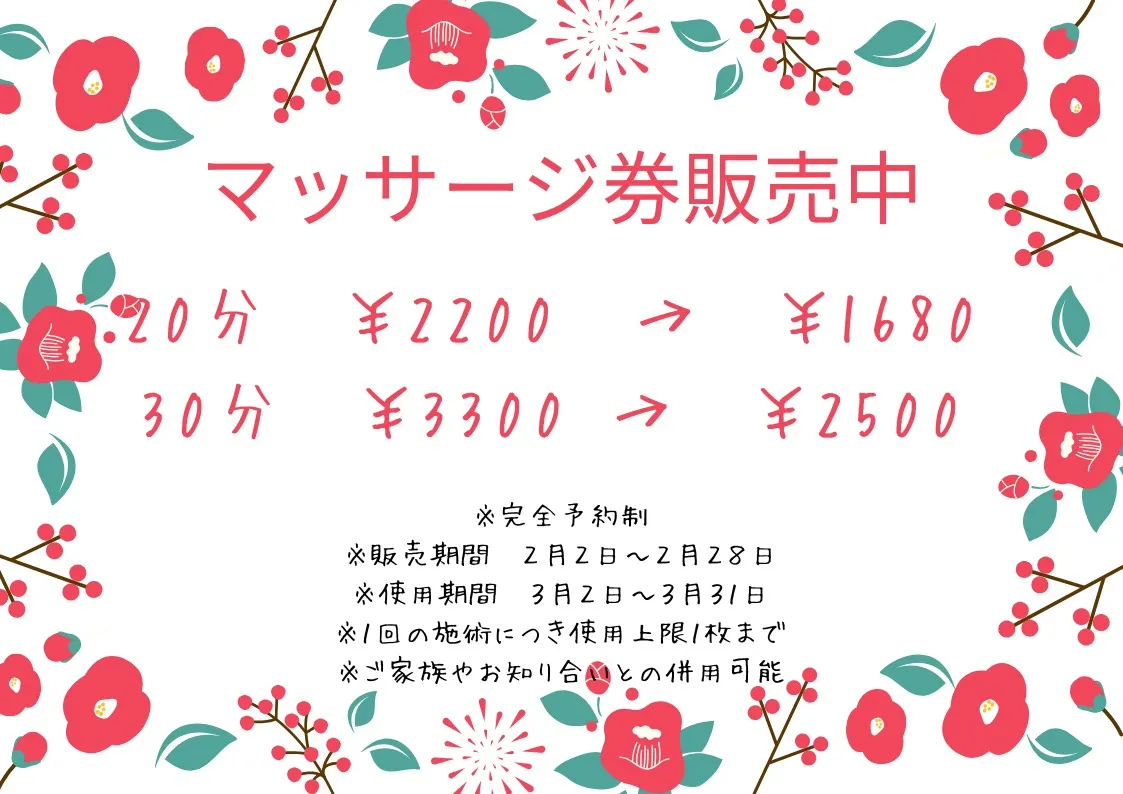 あっという間に2026年1月が終わり、本日から新たに2月が始まりますね✨皆様の多大なるご応援に感謝しつつ、1月に続きこの2月もお得なマッサージ券の販売を続けます!疲れた体を癒やすチャンスをお見逃しなく😊