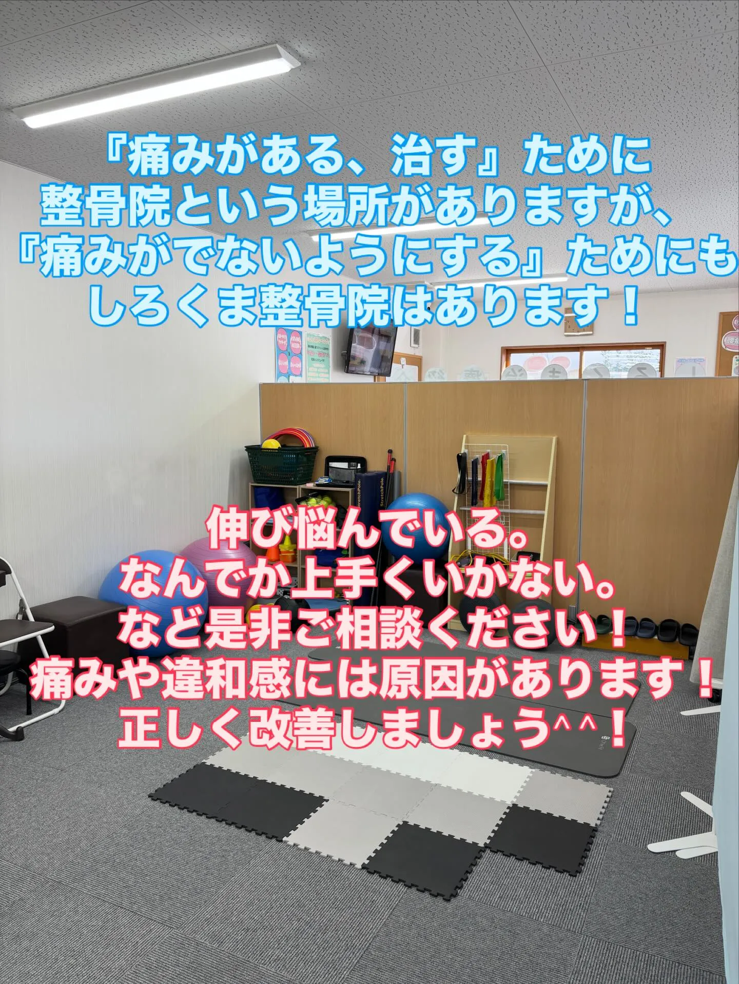 『痛みがある、治す』ために整骨院という場所がありますが、『痛みがでないようにする』ためにもしろくま整骨院があります!